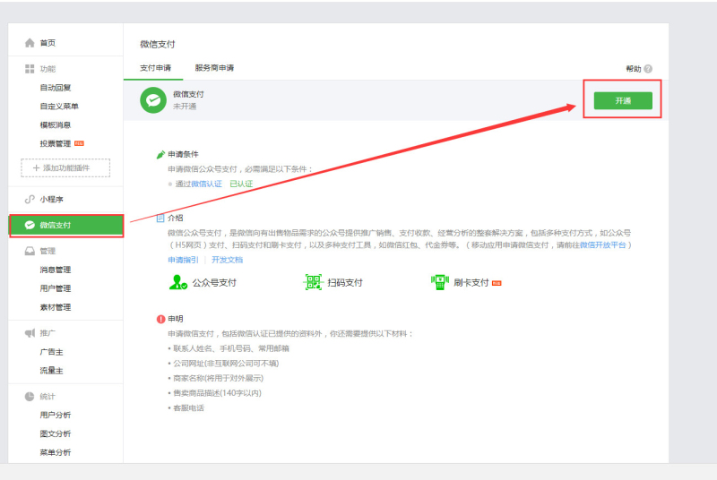 (1)登錄你的微信公眾號(hào),點(diǎn)擊“微信支付”--點(diǎn)擊“開(kāi)通”