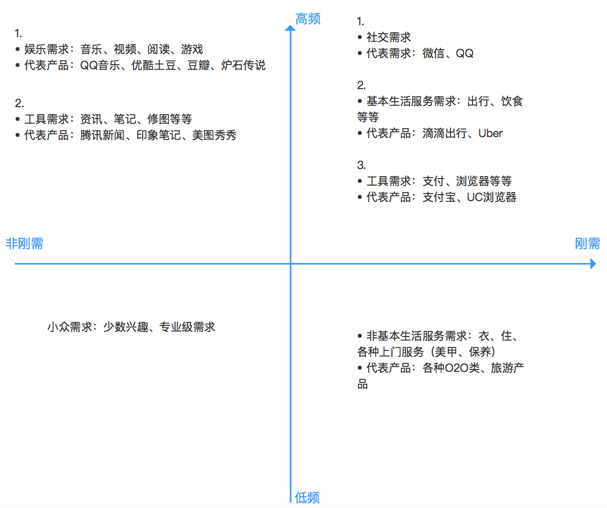 對于高頻、非剛需的使用場景,由于里面涉及的產(chǎn)品類型較多(內(nèi)容型、工具型、社區(qū)型、游戲型),要試情況而定:娛樂類需求(閱讀、音樂、視頻、游戲、社區(qū))。