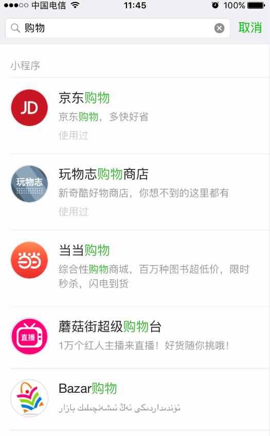 除了使用過這一因素外,當我們搜索某個關(guān)鍵詞時,小程序的排列順序似乎讓我們看不懂。其實,微信為了大力推廣小程序,對于越早入駐的商家越在排名上給予支持,也就是注冊越早越靠前(不同的手機略有不同,絕大部分搜索到的小程序以及排名是一致的)。