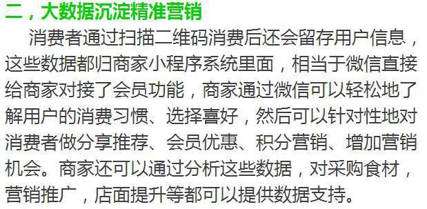 小程序的核心是線下,每個線下餐廳,都應(yīng)當有二維碼,將線下的流量匯集到線上,再將線上的流量反哺給線下,線下線下場景互通。對餐飲老板來說,做一個app成本費用太高、使用頻率太低,投入與回報不成正比,不太實際。而現(xiàn)在消費者只需企業(yè)小程序掃描二維碼,就可以接入企業(yè)小程序,馬上就能看見菜單,從而完成點餐,付款、外賣、評價等一系列操作。消費者不需要下載app,也不需要關(guān)注公眾號,也不用排隊等待服務(wù)員,同時微信小程序用起來也比H5方便快捷。