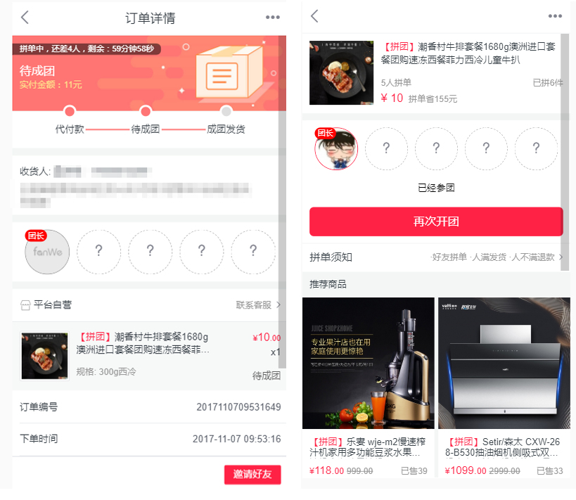 拼團商品有兩種購買方式,一種是直接購買(和普通商品商品購買流程一樣),另一種是拼團購買(成團后才算購買成功,反之退款)。