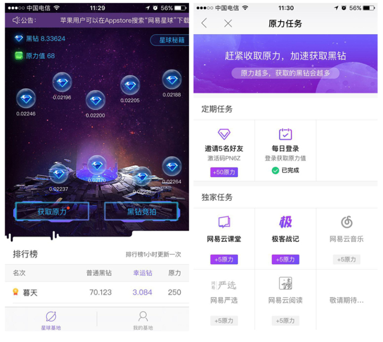 根據(jù)“網(wǎng)易星球”規(guī)則,“黑鉆”基于“原力”(“原力”即算力)產(chǎn)生,用戶可以通過完成登錄、邀請(qǐng)好友等任務(wù)獲得原力,原力越高,獲得的“黑鉆”越多。