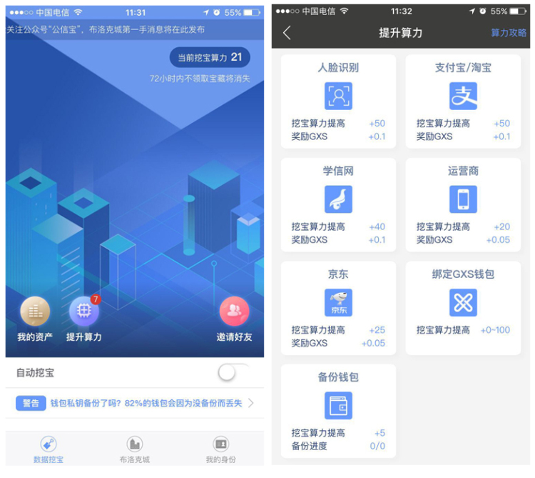 而公信寶提出了用數(shù)據(jù)挖礦的服務(wù),門檻很低,用戶提供越多的個(gè)人數(shù)據(jù),如綁定人臉識(shí)別、支付寶/淘寶、學(xué)信網(wǎng)等,算力就越高,挖出的礦也就越多。