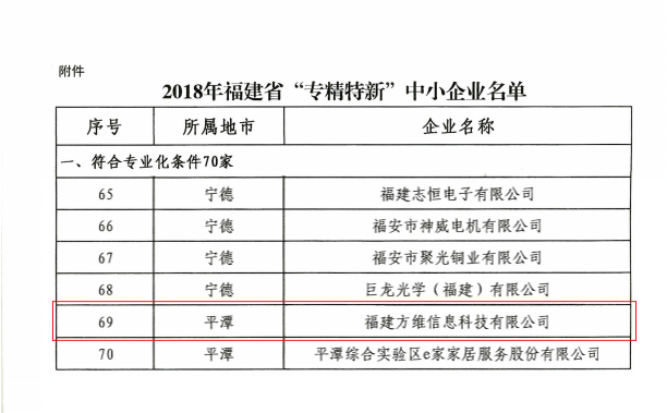 近日,福建省工業(yè)和信息化廳、福建省財政廳公示了2018年福建省“專精特新”中小企業(yè)的名單。經(jīng)過專業(yè)的評審認定,福建方維信息科技有限公司憑借在互聯(lián)網(wǎng)領域的創(chuàng)新技術與專業(yè)實力,從眾多優(yōu)秀的企業(yè)中脫穎而出,成功入選。