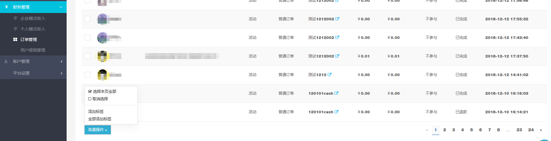 在【財務管理--訂單管理】中,選擇某些訂單用戶手動添加標簽。