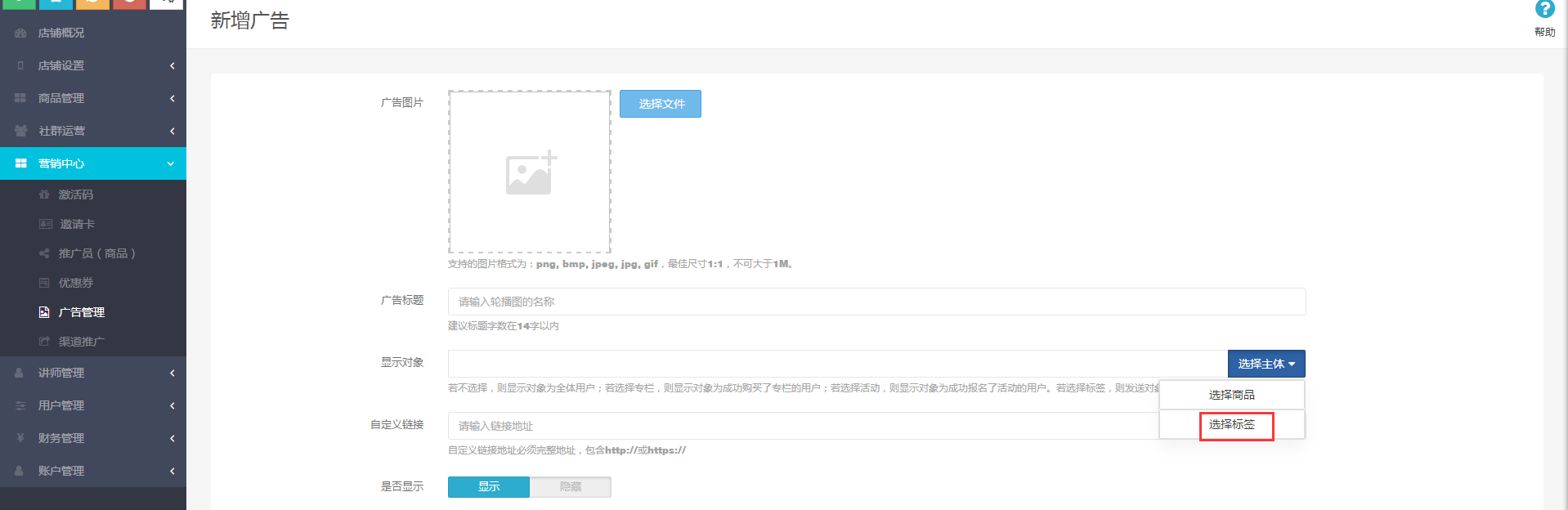 在后臺營銷中心中??梢韵蛱囟撕灥挠脩敉扑褪醉搹棿皬V告。