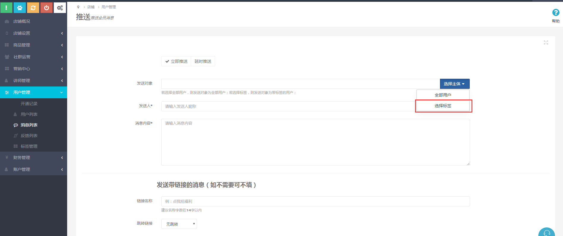 用戶標簽管理功能的使用,意味著店鋪的用戶畫像正在逐漸形成。運營者配合用戶標簽,對同類型的標簽用戶進行更靈活、更有針對性的營銷活動。