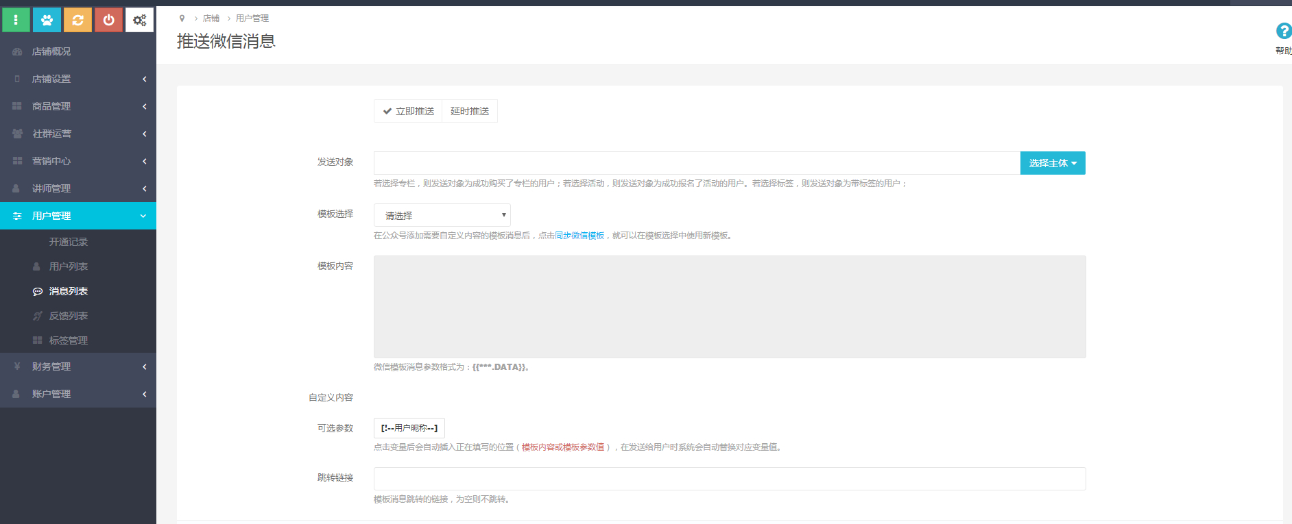 向特定標簽的用戶推送系統(tǒng)消息,開通企業(yè)模式并添加自定義模板消息后,還可以推送自定義微信消息。