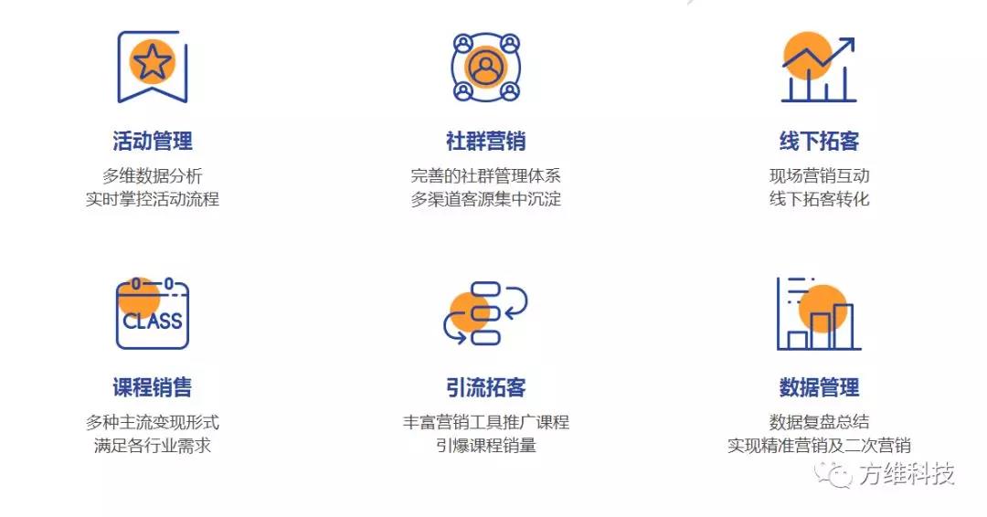 通過方維教育O2O系統(tǒng),將線上培訓(xùn)課程與線上豐富的營銷渠道結(jié)合,并吸引用戶進入線上社群,線上、線下場景高度融合更能凸顯教育+互聯(lián)網(wǎng)的優(yōu)勢: