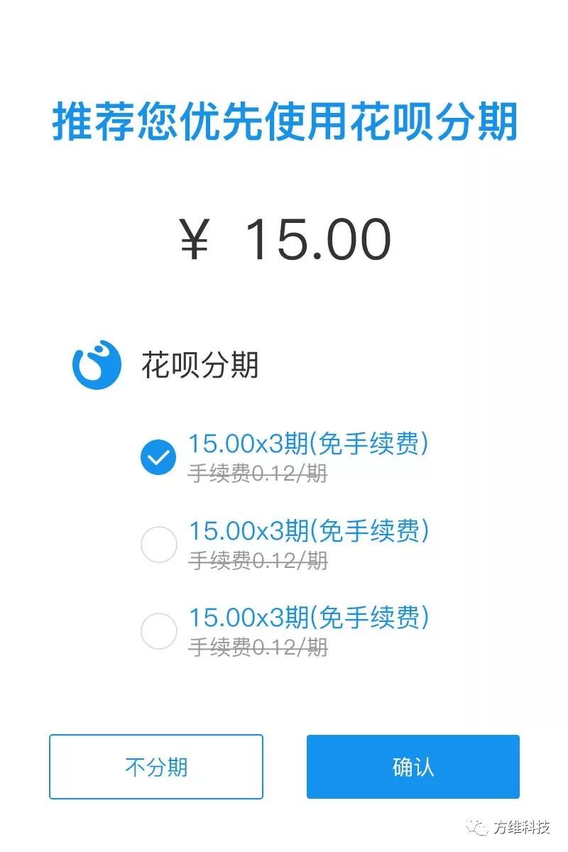 支持使用花唄分期支付功能,商家可選是否開啟花唄分期限制金額及是否免手續(xù)費(fèi),當(dāng)消費(fèi)金額超過設(shè)置金額,蜻蜓設(shè)備將自動(dòng)為用戶提供花唄分期支付服務(wù),消費(fèi)者可自行選擇是否使用。