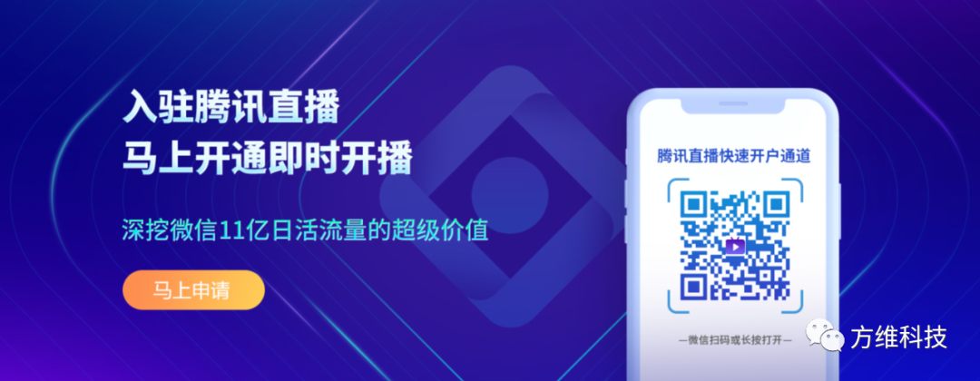 可咨詢方維商務(wù)經(jīng)理獲取騰訊直播官方申請(qǐng)鏈接,方維將提供騰訊直播開通指導(dǎo)。