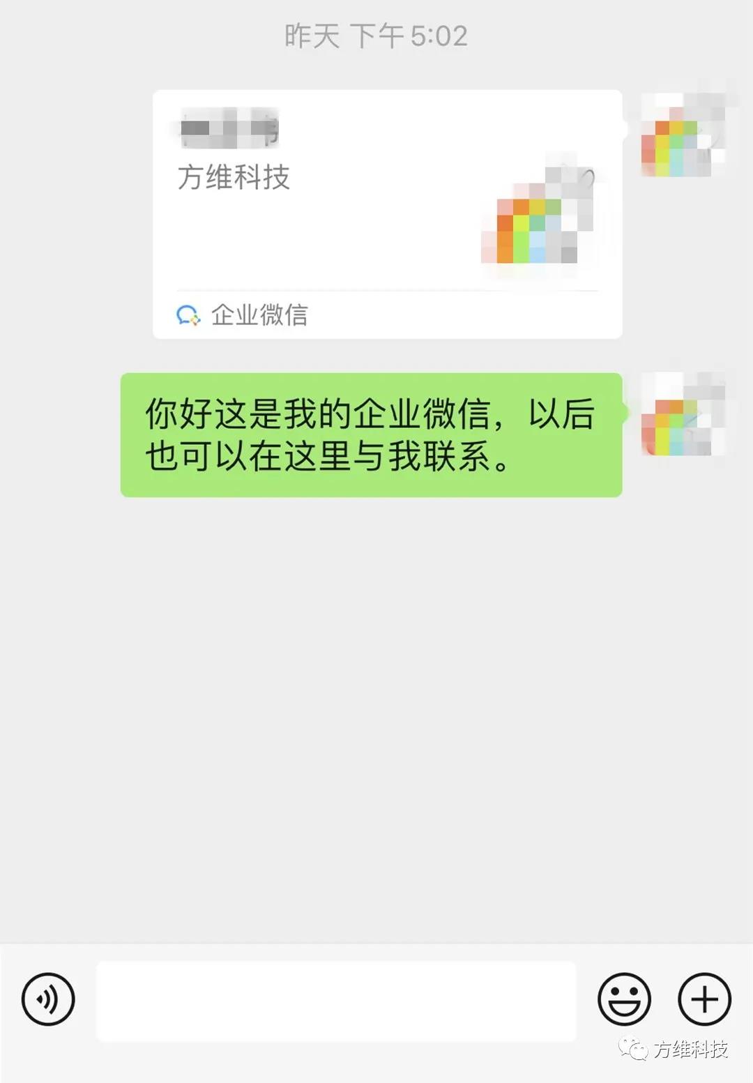 員工可直接使用企業(yè)微信賬號(hào)添加微信用戶。發(fā)起好友添加后,微信好友將收到企業(yè)微信個(gè)人名片,掃碼后即可成為企業(yè)微信好友。