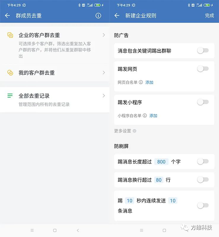 客戶群可開啟防騷擾,將發(fā)廣告、刷屏的群客戶自動(dòng)移出群聊,并設(shè)為禁止入群。