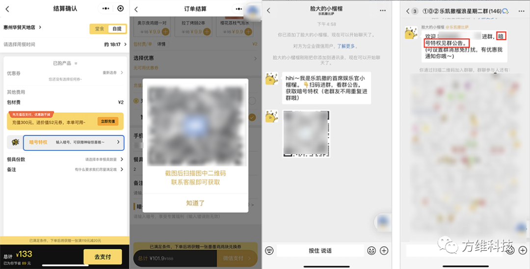 樂凱撒在點餐小程序的下單界面,設(shè)置了一個“暗號特權(quán)”模塊,擁有特權(quán)的話,本單可以免費領(lǐng)一份小食。用戶只需掃碼添加工作人員的企業(yè)微信,加入企業(yè)微信群,即可在群公告中獲得暗號,暗號及贈送小食都會不定期更換。