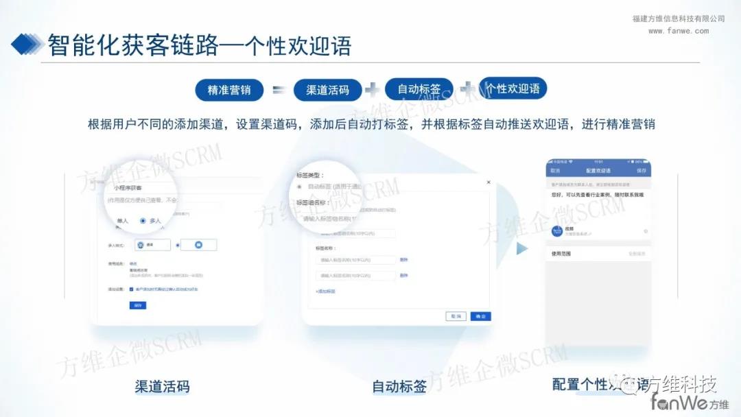 企業(yè)微信活碼還可以結(jié)合標簽管理,更精細地管理不同渠道的客戶?!痉骄S企微SCRM】在此基礎(chǔ)上又升級了玩法,添加「個性歡迎語」,實現(xiàn)不同來源的客戶,打不一樣的招呼。