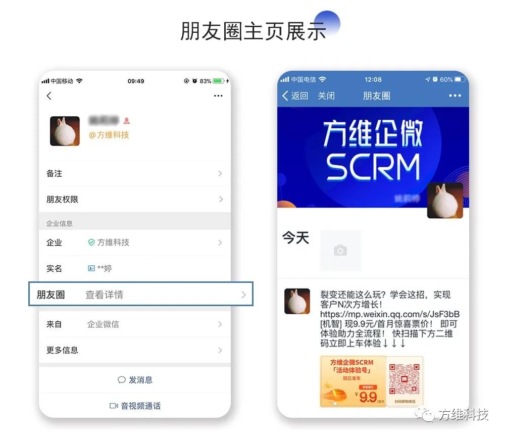 當(dāng)客戶初次添加企業(yè)員工或在朋友圈看到相關(guān)推送內(nèi)容時(shí),可能進(jìn)一步查看員工朋友圈主頁,以獲得更加全面的了解。方維企微SCRM突破限制對客戶“開放”朋友圈,使客戶能第一時(shí)間了解企業(yè)產(chǎn)品,提高轉(zhuǎn)化效率。