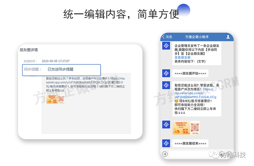 企業(yè)管理員可統(tǒng)一編輯內(nèi)容,一鍵發(fā)送至方維企微SCRM打造的朋友圈主頁內(nèi),作為朋友圈主頁對外展示的素材。