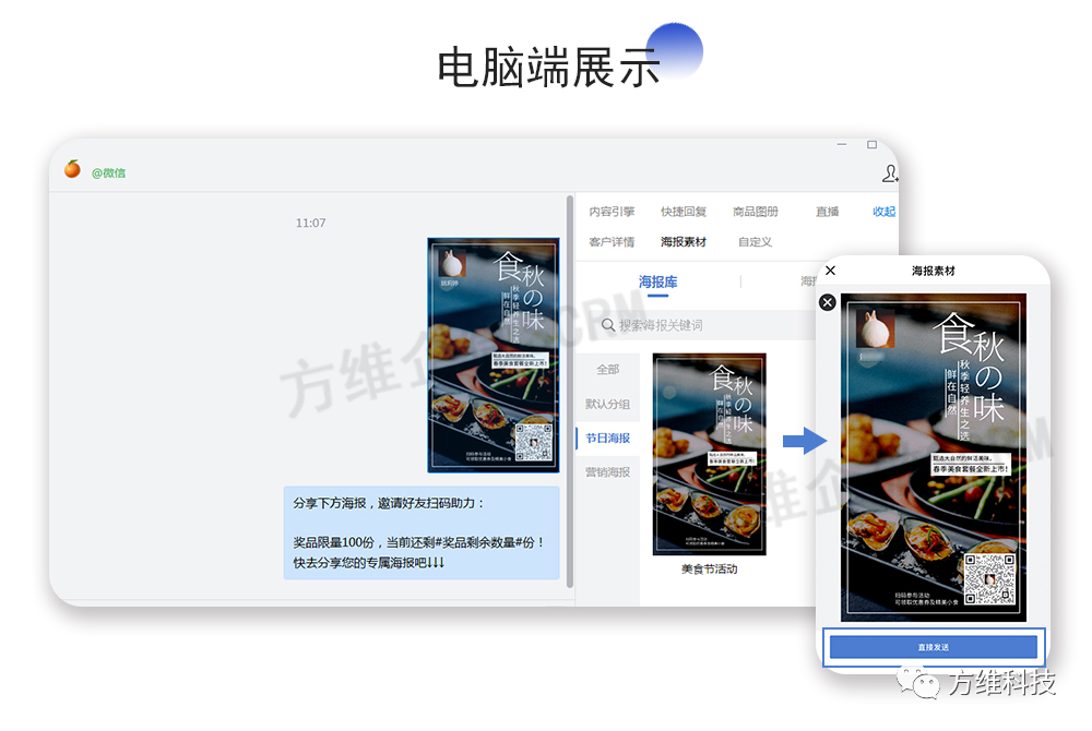 員工在與客戶聊天過程中,打開聊天窗口側(cè)邊欄,即可選擇所需海報(bào)模板并生成個(gè)人專屬海報(bào),一鍵發(fā)送給客戶。