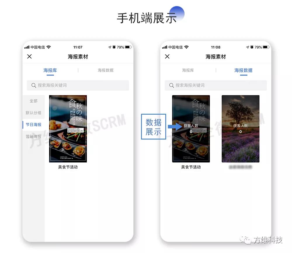 方維企微SCRM升級(jí)了企業(yè)微信工具欄,在聊天窗口的側(cè)邊欄中,添加「海報(bào)庫」功能。一步生成員工專屬海報(bào),并可檢測由海報(bào)進(jìn)入的客戶數(shù)據(jù),統(tǒng)計(jì)推廣效果。