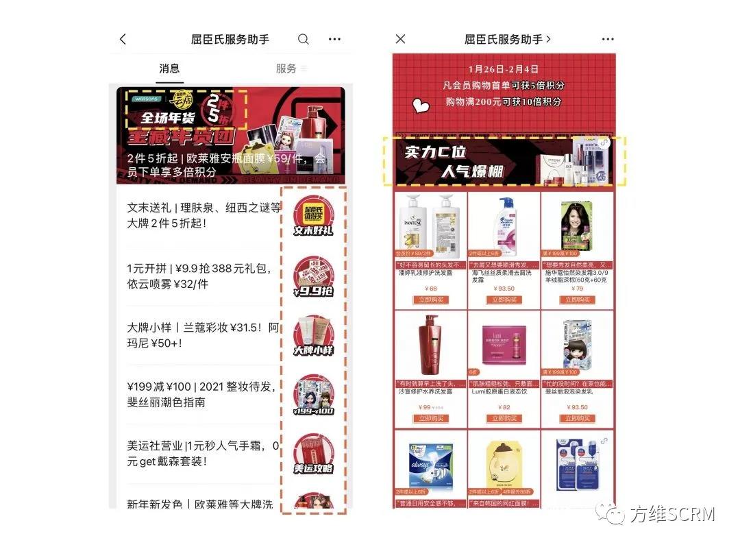 屈臣氏公眾號(hào)的設(shè)置也處處暗藏玄機(jī),方便客戶了解產(chǎn)品,并通過(guò)各個(gè)入口進(jìn)入私域或直接轉(zhuǎn)化。