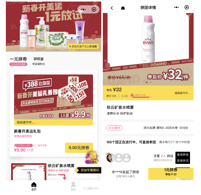 除了常規(guī)的商城銷售之外,屈臣氏還做了一個(gè)裂變小程序,叫做「屈臣氏值得拼」。用戶可以通過(guò)將購(gòu)買鏈接分享給好友,享受指定產(chǎn)品的超低折扣(基本是 5、6 折起步)。