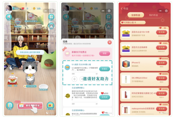屈臣氏做了一款游戲化小程序,叫做「屈擼貓」。游戲里不僅能擼貓,還可以通過(guò)做任務(wù)積攢愛心兌換禮品,比如滿減券、免郵券、神仙水甚至iPhone 12等。同時(shí),游戲內(nèi)的部分任務(wù)玩的次數(shù)有限,需要好友助力,如此一來(lái)又進(jìn)行了一波分享裂變。