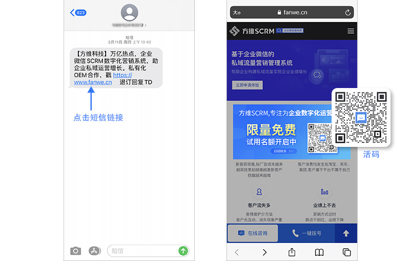 另外,短信中鏈接跳轉(zhuǎn)頁面可鏈接企微活碼,實現(xiàn)活碼的自動分流,將客戶均衡分配給不同客