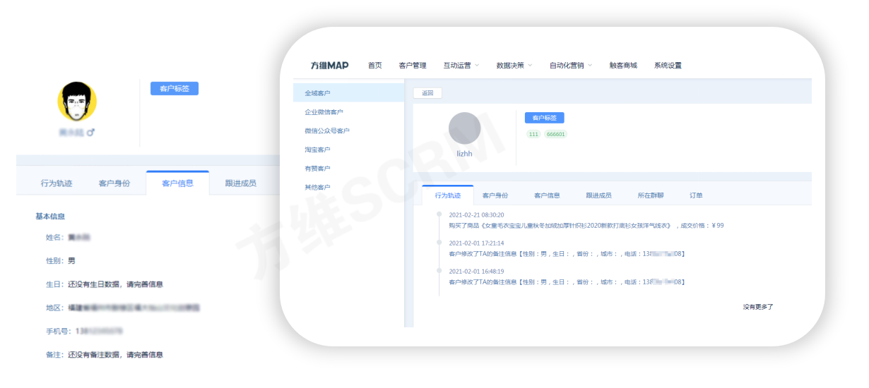 方維SCRM能自動識別用戶“性別、是否是微信粉絲,是否是會員”等基礎(chǔ)信息,顯示在用戶畫像界面。