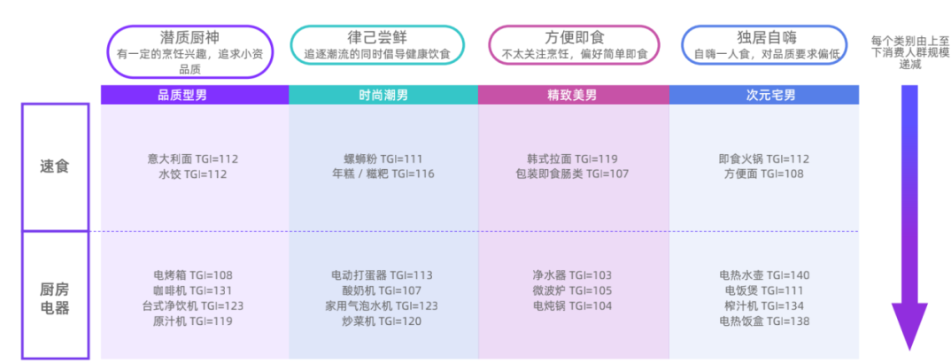 以出售速食和廚房商品的品牌為例,根據(jù)第一步對用戶購買頻次和消費(fèi)偏好的標(biāo)簽,可以對用戶進(jìn)行分層,不同生活習(xí)慣和風(fēng)格的用戶,對食品和電器的需求有很大差別,推薦對應(yīng)商品轉(zhuǎn)化率更高。