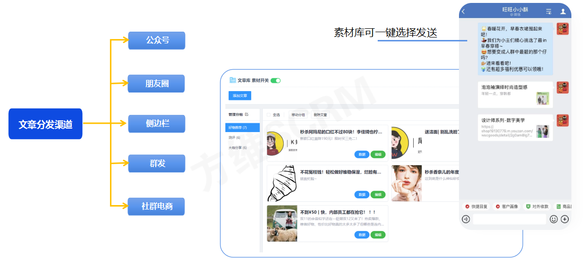 對用戶進(jìn)行推送,不斷建立起用戶的喜好標(biāo)簽,進(jìn)而精準(zhǔn)群發(fā)推送相關(guān)品類的優(yōu)惠券和活動,達(dá)成營銷目的。文章可使用方維SCRM素材庫一鍵選擇發(fā)送,分發(fā)渠道多樣可選。