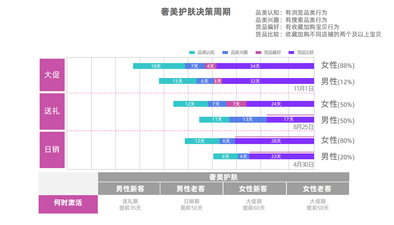 同時在不同的決策節(jié)點(diǎn)(618、情人節(jié)、雙十一等),有目的性的宣傳推送。以下以美妝護(hù)膚品為例,大促重點(diǎn)拉女性新客,送禮抓男性新客,日銷做好老客運(yùn)營,并將更多的新客沉淀成復(fù)購老客,擴(kuò)大復(fù)購人群。