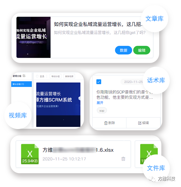 打造企業(yè)公共“內(nèi)容庫(kù)”,包括「文章庫(kù)、視頻庫(kù)、文件庫(kù)」,支持文件、表單、海報(bào)、視頻等多樣內(nèi)容格式。企業(yè)可預(yù)先設(shè)置:價(jià)格表、產(chǎn)品介紹、宣傳視頻、解決方案等內(nèi)容,方便銷售人員快速獲取內(nèi)容,一鍵發(fā)送。
