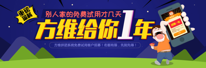 活動內(nèi)容:方維招募10名幸運客戶,免費獲得方維拼團系統(tǒng)1年使用權(quán)限,名額有限,先到先得!