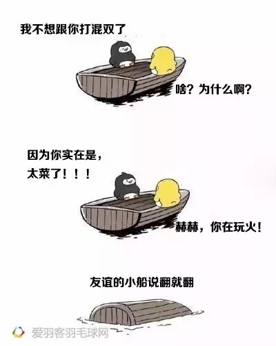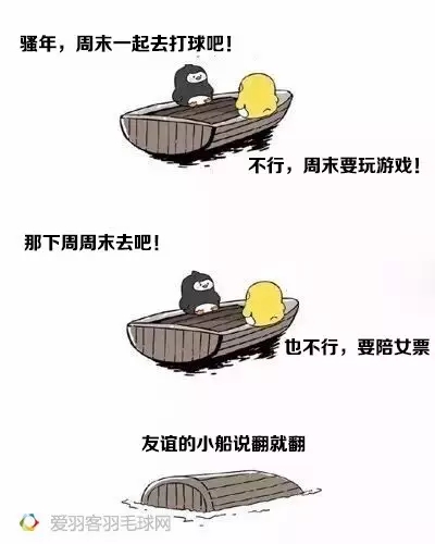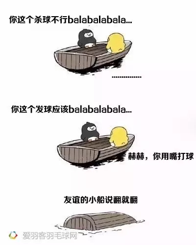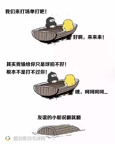 近日,一個友誼小船的段子可謂是刷爆了小編的朋友圈,于是小編就想到了羽毛球場上那些自己與球友之間友誼小船翻掉的梗。所以,友誼的小船球友版,重磅來襲!趕緊收藏起來去調(diào)戲球友吧。