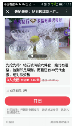 他們的具體游戲規(guī)則是,3人成團(tuán),一起拼團(tuán)殺價(jià)購買6個(gè)玻璃杯。也就是說,任何一個(gè)人都可以開團(tuán)成為團(tuán)長,邀請(qǐng)自己的朋友來購買,一旦湊到3個(gè)人參團(tuán),此拼團(tuán)即為成功,這三個(gè)人都可以以7.8元的優(yōu)惠價(jià)格購買6個(gè)彩色玻璃杯的套裝;而一旦已經(jīng)有3個(gè)人參團(tuán),第四個(gè)人想要參團(tuán)的話,頁面就會(huì)提醒他“該團(tuán)已滿,請(qǐng)開新團(tuán)”,那么這位第四個(gè)人就需要重新開一個(gè)新團(tuán),這樣對(duì)商家來說就達(dá)到了裂變的目的。