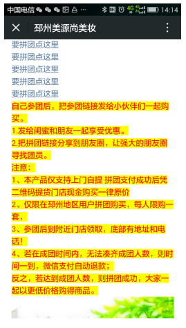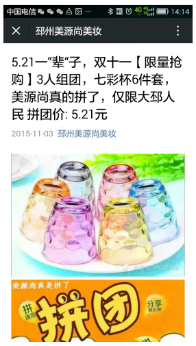 于是,美源尚的40多位工作人員首先每人開了2個(gè)團(tuán),然后分享到朋友圈,來邀請(qǐng)加在他們微信上的老顧客來參團(tuán),由于價(jià)格非常優(yōu)惠,因此立刻吸引到了眾多的人來參團(tuán)以及開新團(tuán)。原本工作人員的目標(biāo)是希望可以裂變出100、200個(gè)團(tuán),結(jié)果沒想到,幾天下來,整個(gè)邳州市的朋友圈都被他們的杯子刷屏,最后在短短三天的時(shí)間里就裂變出了1000多個(gè)團(tuán)。由于他們?cè)O(shè)置了所有人都必須到線下提貨,于是近三千的人流都被引到了他們的線下門店領(lǐng)取這6個(gè)玻璃杯,并進(jìn)行二次消費(fèi)。同時(shí),由于微信拼團(tuán)工具一般都支持參團(tuán)的人默認(rèn)關(guān)注該服務(wù)號(hào),成為粉絲,于是美源尚美妝的服務(wù)號(hào)在短短幾天內(nèi)就累計(jì)了幾千個(gè)新粉絲,也為他們?nèi)蘸蟮亩然顒?dòng)的開展做好了鋪墊。