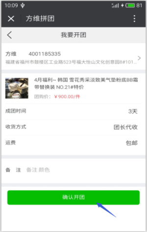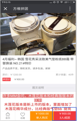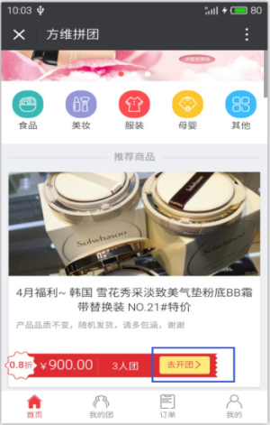 1、用戶進入商家拼團平臺,選擇好所要拼團的商品,點擊“去開團”就可以直接進入開團頁面。進入開團頁面后,點擊下方的“3人成團”(這里的3人是由商家自行設(shè)定的成團人數(shù)),等待頁面繼續(xù)跳轉(zhuǎn)。