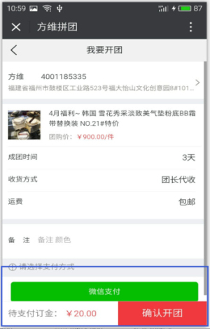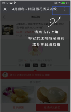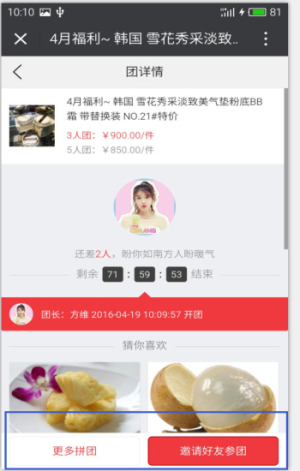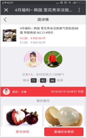 3、用戶支付金額后即可開團成功,進入邀請好友參團或參加其它拼團活動