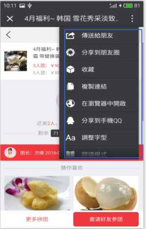 4、點擊邀請好友參團,可選擇通過朋友圈、直接發(fā)送好友等方式進行邀請。