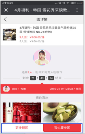 5、好友點擊鏈接進入,點擊“我也要參團”即可進入?yún)F或點擊“更多拼團”進行其他商品拼團選擇。好友參團后確認支付即可完成此次拼團活動的參團,然后繼續(xù)點擊“邀請好友參團”就可將拼團活動繼續(xù)傳播下去。(如若此次拼團人員已滿,則下一位用戶點擊鏈接進入后將會提醒用戶該團已滿,必須開新團繼續(xù)傳播)。