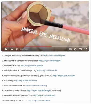 然而,觀眾的直接購買途徑和體驗卻并不那么“人性化”,制作者還是只能通過在視頻中著重說明所用的化妝品及羅列購買清單鏈接的形式(如下圖)引導(dǎo)消費者購買,既難記又麻煩。