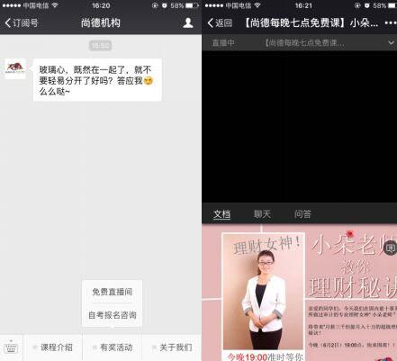 除此之外,尚德教育的微信號也直接對接了直播入口,由公眾號進入就可觀看直播,從訪問入口上直接提升直播流量。