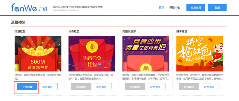 1 、選擇方維流量紅包應用,點擊“立即創(chuàng)建”