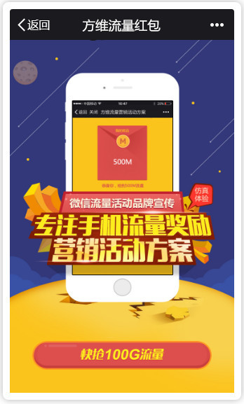 8 用戶成功領(lǐng)取活動流量紅包后,自行點擊右上角分享給好友或轉(zhuǎn)發(fā)到朋友圈,實現(xiàn)以老帶新,拉新增粉。好友通過用戶分享的鏈接可查看到活動頁面,刺激其參與;