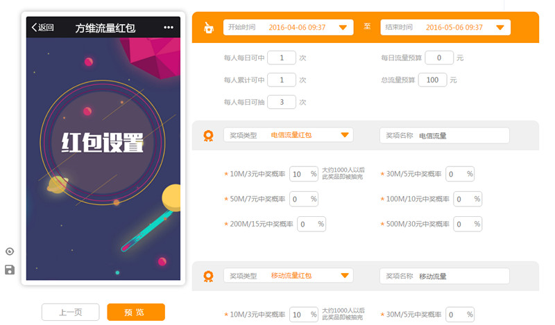 3 商家可對活動時間、紅包類型、中獎幾率、個人IP每日抽獎次數(shù)等條件進行相應的設(shè)置,設(shè)置完成后后臺會自動生成活動鏈接;
