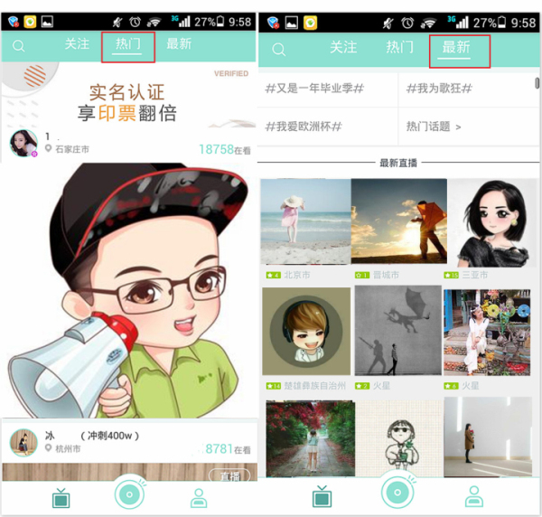 另外,為了照顧新主播的發(fā)展,“最新”頻道頁上方還顯示有熱門話題,粉絲點擊話題會進入對應話題的直播列表,這樣新主播或發(fā)展中的主播可通過給自己的直播添加話題,來吸引一部分粉絲的關注。
