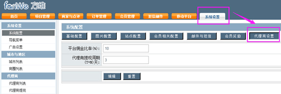 如圖所示,平臺方登錄方維城市O2O系統(tǒng)后臺后,根據(jù)方維君的指示,在系統(tǒng)設(shè)置中選擇代理商設(shè)置,就能自定義編輯代理商設(shè)置中的所有信息了呢~下面我們就來具體的說明一下吧~