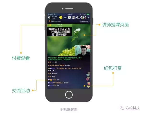 將方維內容付費直播系統(tǒng)接入在線教育平臺系統(tǒng),平臺入駐教師利用手機或其他設備均可進行直播,在線即可互動交流、共享講義,部分直播間付費可觀看??扇菁{百萬人同時在線觀看,全網加速高清直播無卡頓。